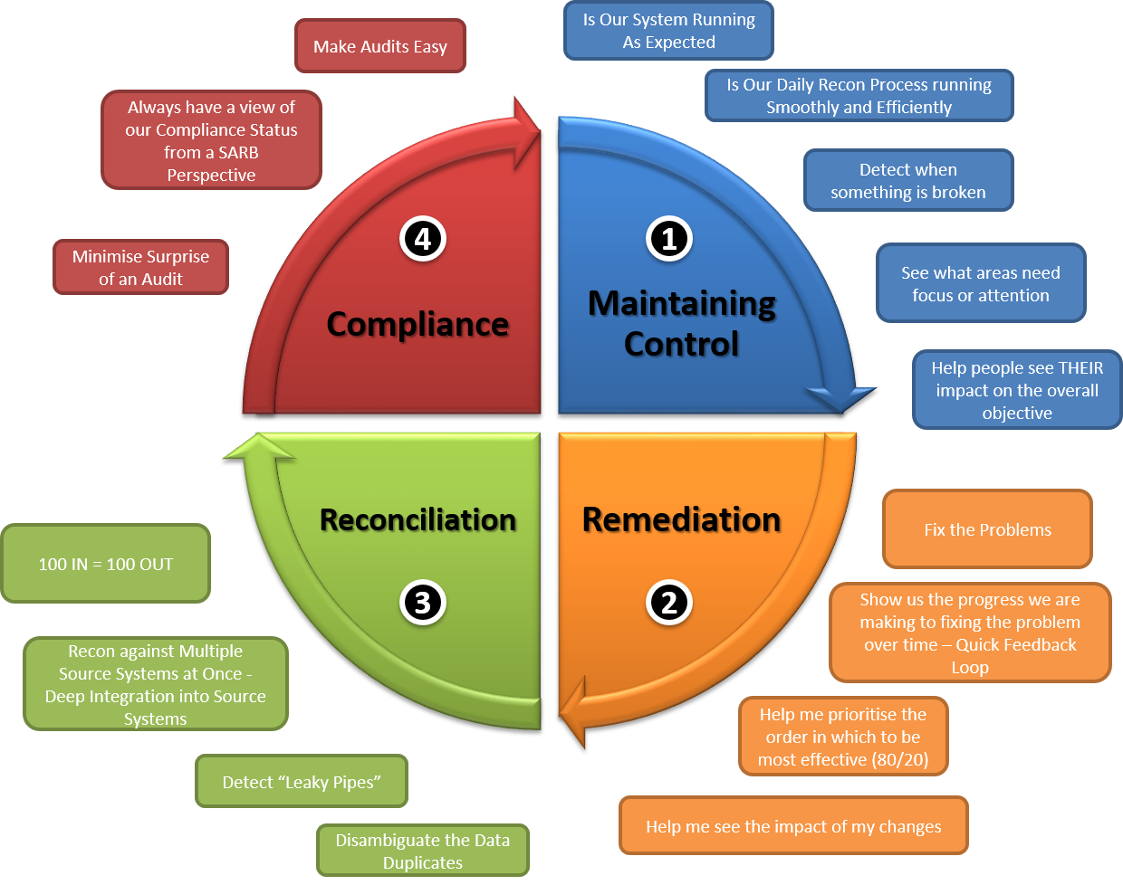 The daily reconciliation process can be rather onerous. Having information about the current state of reconciliation makes it evident that the various people throughout the process are maintaining control of the system. Here we want deep integration into the source systems so that automated reconciliation can be done with little or no manual intervention. This is one of the SARB requirements so having clear transparency into the process not only addresses an operational concern but also a compliance concern.