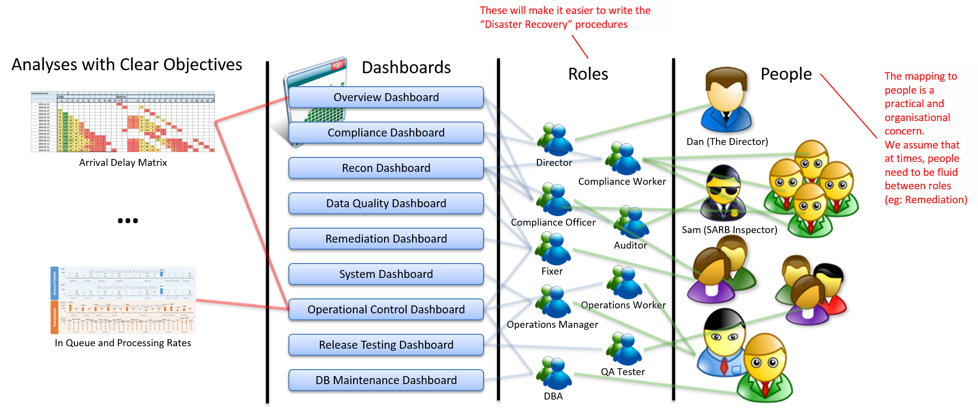 Each analysis is designed to meet specific needs of the pillars. Individual people can perform multiple roles. The dashboards are what tie them all together.